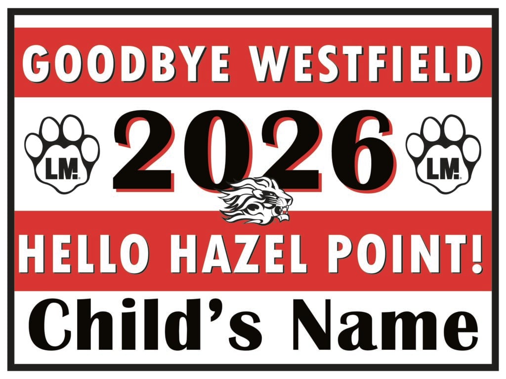 Order single-sided or double-sided yard signs with your child’s name to celebrate their graduation from Westfield to Hazel Point!
